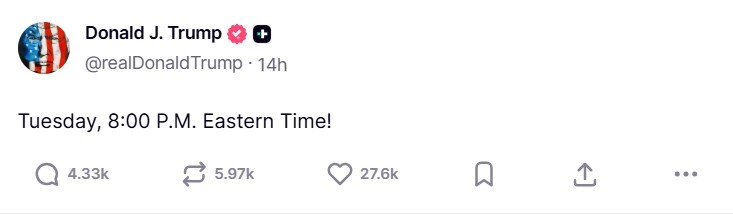 وفي منشور غامض آخر، اكتفى ترامب بكتابة "الثلاثاء، الساعة 8:00 مساء بالتوقيت الشرقي"، دون مزيد من التفاصيل.