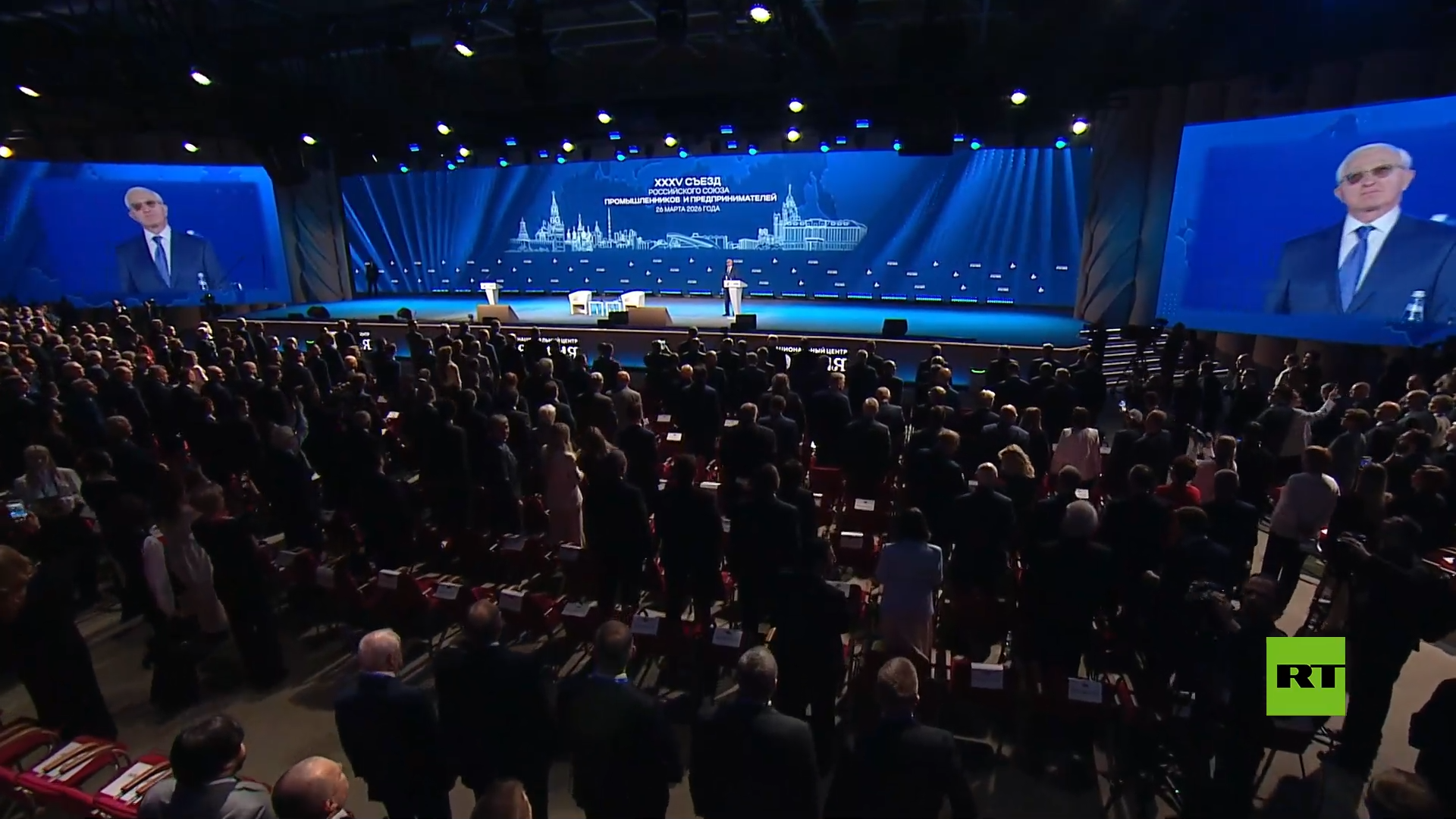 المشاركون في مؤتمر الاتحاد الروسي للصناعيين ورجال الأعمال يؤدون النشيد الوطني بدون مصاحبة موسيقية