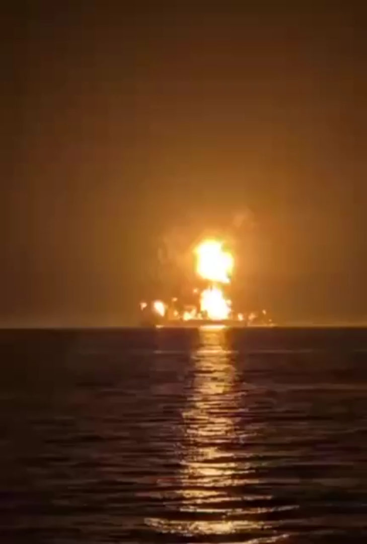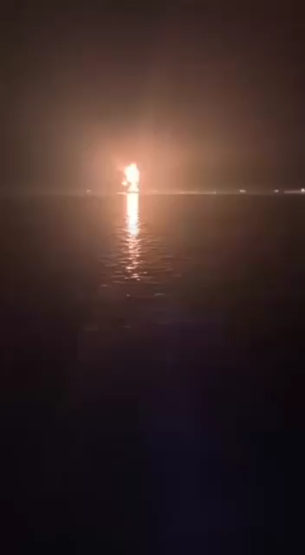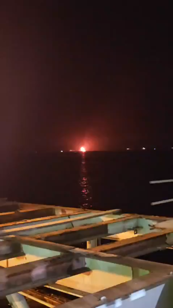 ووثقت مقاطع فيديو مقاطع فيديو وثقت ناقلة النفط والنيران تلتهما وألسنة الدخان تتصاعد في السماء.